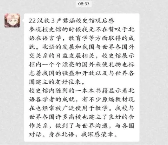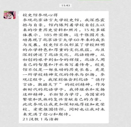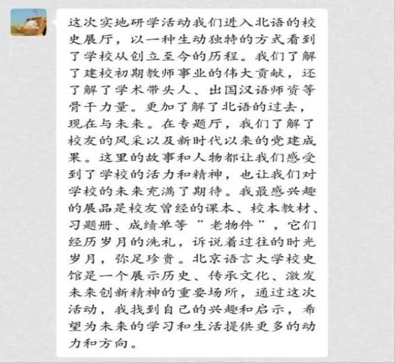 学员们在参观后深受启发,以留言的方式纷纷表示,北语的党建工作和党纪教育给他们留下了深刻的印象,并激发了他们将党史学习和红色精神融入日常生活的决心。同学们深刻认识到,作为一名党员发展对象,要不断加强党性修养,严于律己,认真学习党纪条例,将北语的红色基因与梧桐精神传承下去,内化于心、外化于行,以实际行动践行党的宗旨与校训。