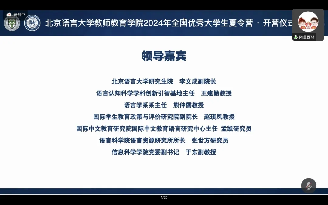 上午九时,在介绍北语历史与特色的宣传片播放结束后,夏令营开营仪式正式开始,教师教育学院院长施家炜教授主持。出席开营仪式的领导嘉宾有:北京语言大学研究生院李文成副院长、语言认知科学学科创新引智基地主任王建勤教授、语言学系系主任熊仲儒教授、国际学生教育政策与评价研究院副院长赵琪凤教授、国际中文教育研究院国际中文教育语言研究中心主任孟凯研究员、语言科学院语言资源研究所所长张世方研究员、信息科学学院党委副书记于东副教授,以及北京语言大学教学委员会主任、教师教育学院博士生导师程娟教授,教师教育学院院长施家炜教授、党委书记王孝强博士、教育学原理专业负责人郭睿教授等。