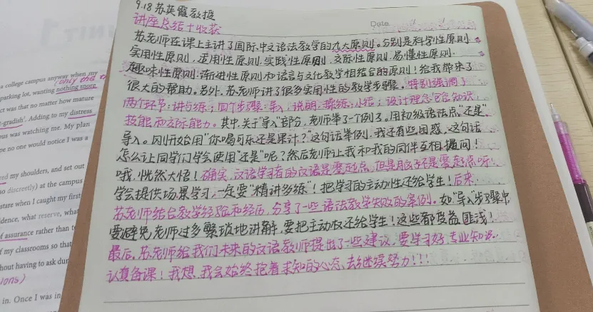 今天很荣幸地聆听了苏英霞老师的“国际中文语法教学的九大原则”主题讲座,受益颇多。首先于我个人而言,本次讲座的内容完美解决了我上学期学完《现代汉语(下)》之后的遗留问题:语法教学怎么教?因为作为一个中国人,我很惭愧,我自己的语法其实并没有那么精细、精密,有时候也会犯一些错误。但是苏老师的讲座却为我提供了很多很新很好的思路,我相信这对于我未来的发展有很大的帮助!其次,这次讲座让我明白了,在削弱语法教学的语言教学背景大趋势之下,语法教学依旧不可或缺,甚至它比我们想象的更为重要。一个小小的语法竟然蕴含着这么大的学问与智慧,由此也可见汉语国际教育真不是一门“小儿科”而是一门“大学问”!