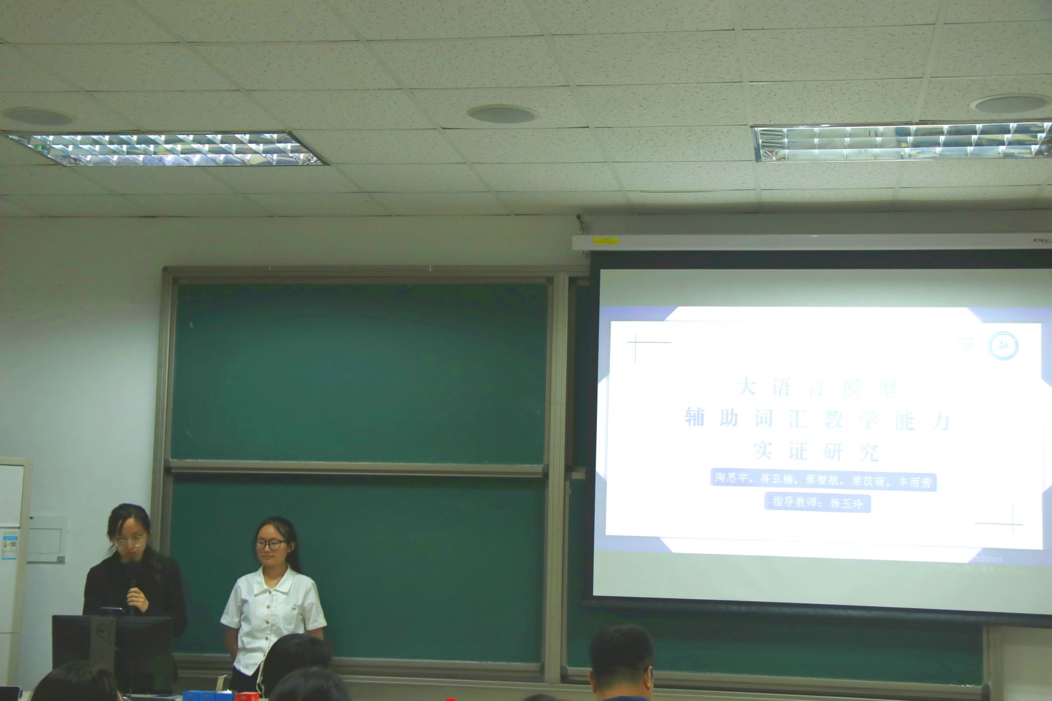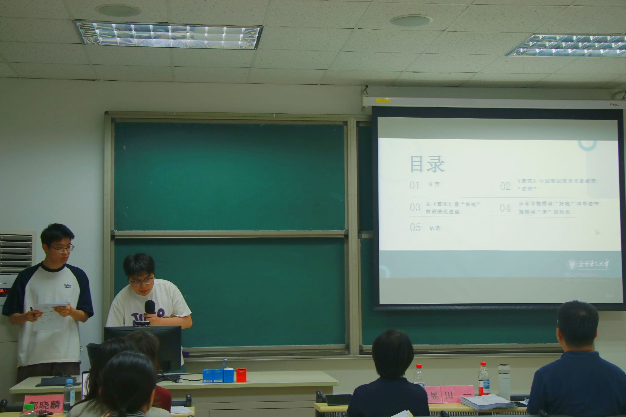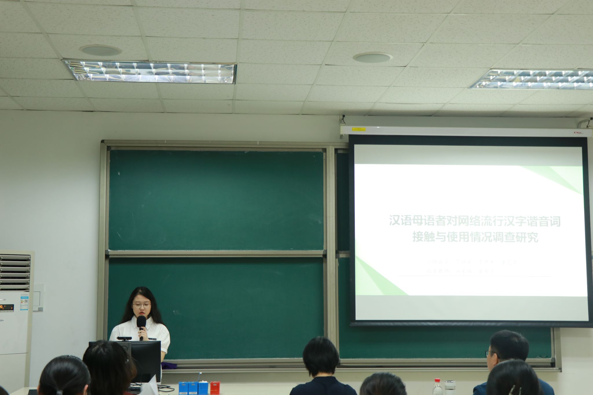 英才计划的三组同学率先汇报,大创项目紧随其后,十二组同学接力展示。各小组的研究项目涵盖语言学、国际中文教育、人工智能等多个领域,汇报人回顾了本组研究经历,依次从研究背景、学理支撑、方法路径、成果评估等方面进行汇报,清晰地呈现了富有深度的研究成果。