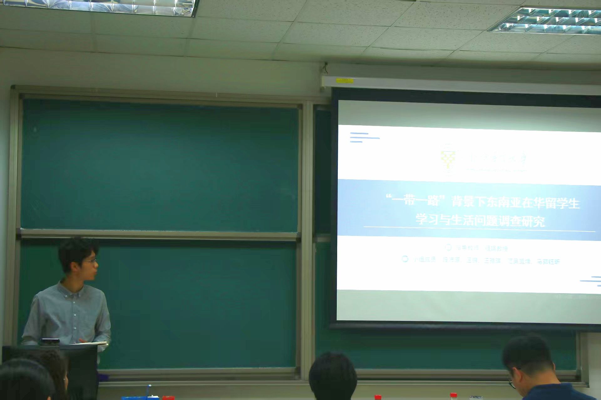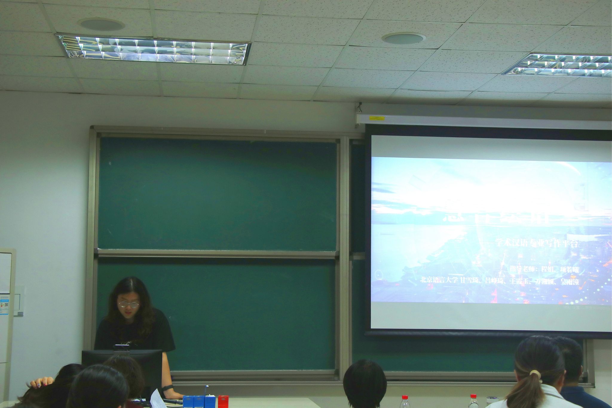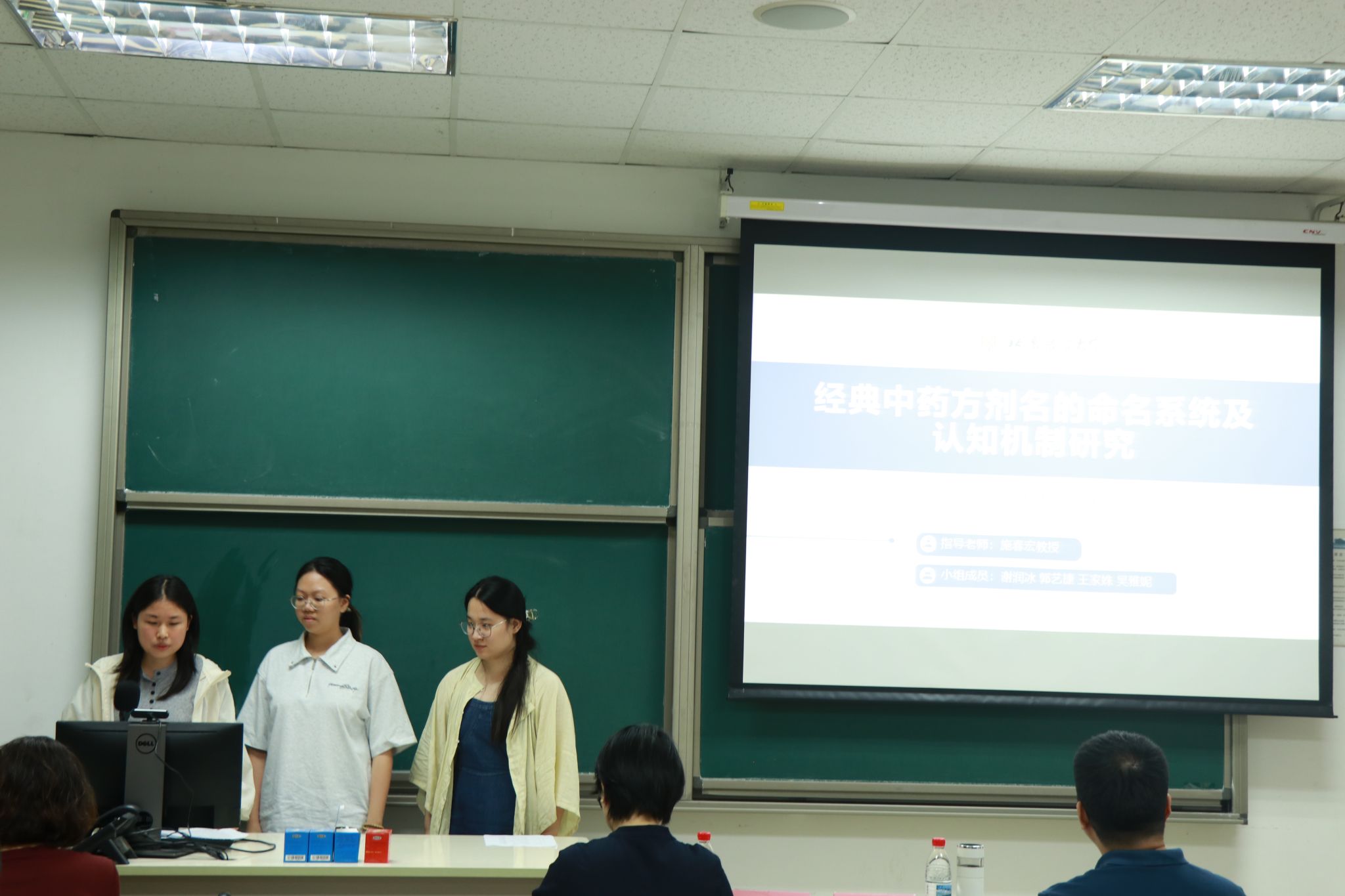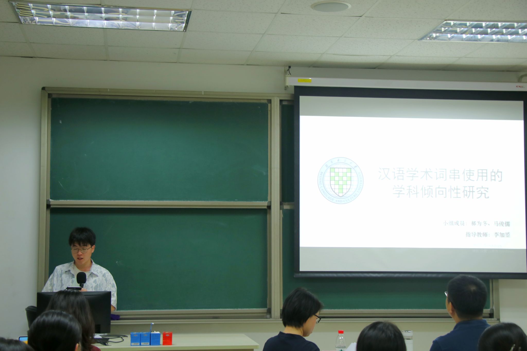 英才计划的三组同学率先汇报,大创项目紧随其后,十二组同学接力展示。各小组的研究项目涵盖语言学、国际中文教育、人工智能等多个领域,汇报人回顾了本组研究经历,依次从研究背景、学理支撑、方法路径、成果评估等方面进行汇报,清晰地呈现了富有深度的研究成果。