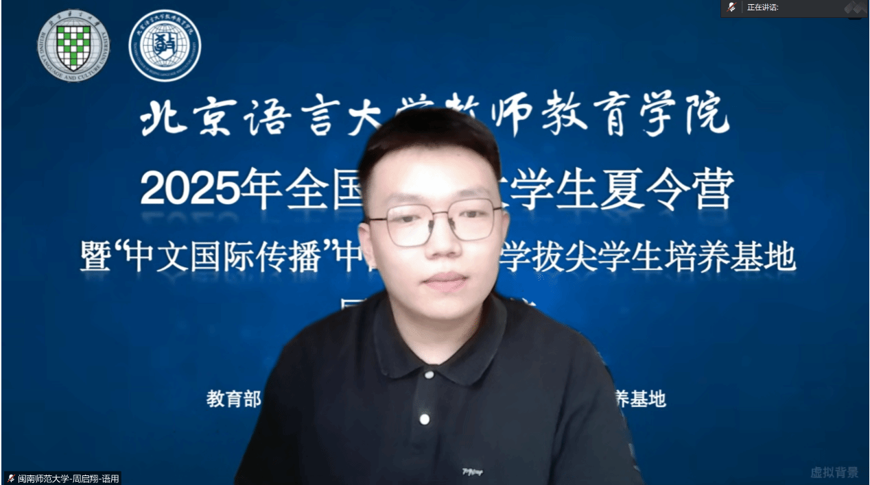 8月12日下午的结营式简短热烈。在导师代表发言环节,教师教育学院博士生导师周小兵教授通过生动的实例阐释了“博学、审问、慎思、明辨、笃行”的治学之道;田一副教授勉励同学们要“读万卷书,行万里路”,培养跨文化、跨学科的学术视野。来自北京语言大学、河南大学、西北师范大学和南开大学的四位营员代表分享了参营感悟,表达了对北语的热爱与向往。