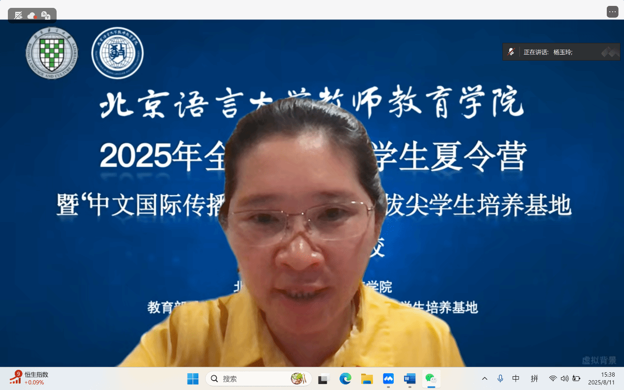 下午的首场“名师讲座”由北京市教学名师杨玉玲教授主讲,玄玥教授主持。杨玉玲教授以“‘大词汇小语法’下的国际中文教学”为题,结合HSK大纲演进与具体案例,深入剖析该教学理念的内涵与实践策略,鼓励营员从实际教学出发,探索符合汉语特点的教学方法。
