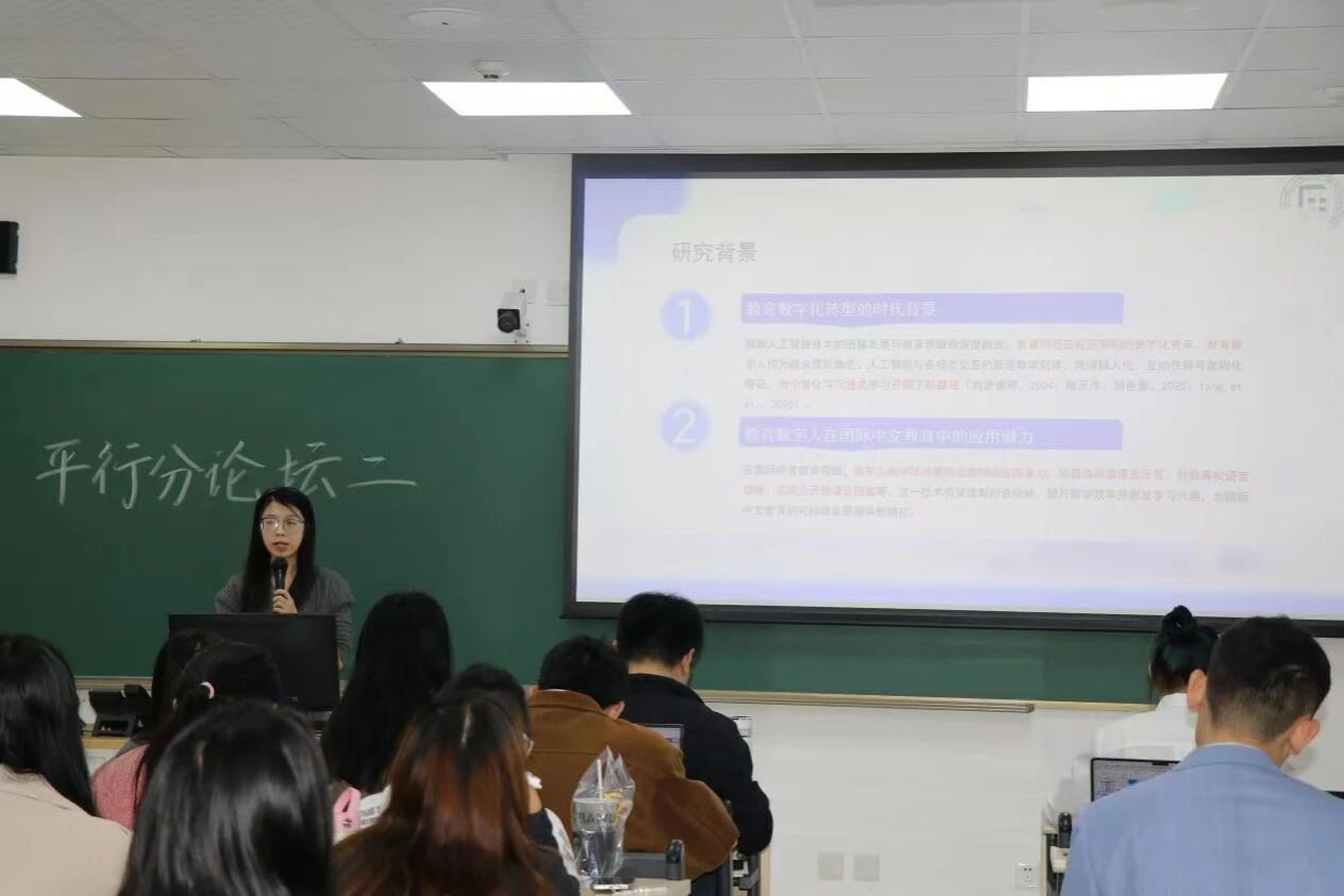 分论坛二以“二语习得研究与教育实践”为主题,同学们聚焦汉语情感词汇认知、中文学术写作教学模式、数字人教师等研究方向,分别以《汉语二语学习者汉语情感词汇认知研究——来自词汇联想和典型情景叙述实验的证据》《基于中外同侪合作的国际中文学术写作教学实训模式构建》《中外学习者对数字人中文教师的使用意愿及影响机制研究——基于UTAUT模型》《元话语视角下生成式人工智能与学生作文写作对比研究》《汉语二语情感词汇认知差异与教学策略探究》《职业发展视域下国际中文教育志愿者政策研究》《国际中文教育学生数字素养指标体系构建研究》为题进行汇报交流。
