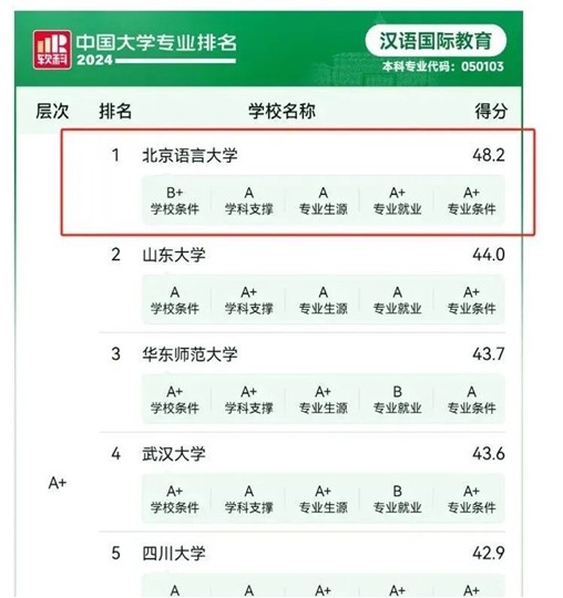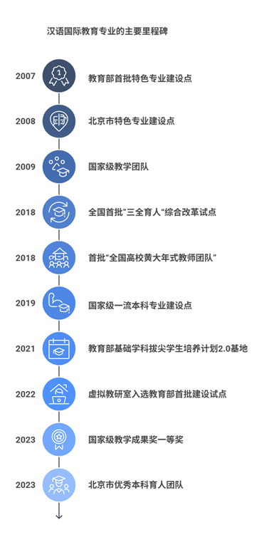 1964年,学院在全国率先设立出国汉语师资本科专业,专门培养出国汉语教学师资。1983年,学院在全国设立首个对外汉语(2012年更名为汉语国际教育)本科专业,为国家培养对外汉语教学专门师资。多年来,学校高度重视汉语国际教育专业建设,该专业先后入选国家级特色专业、北京市特色专业和首批国家级一流本科专业。汉语国际教育专业教学团队先后入选国家级和北京市优秀教学团队。2018年汉语国际教育专业教师团队荣获首批“全国高校黄大年式教师团队”,学院获批全国首批“三全育人”综合改革试点单位。2019年汉语国际教育专业获批国家级一流本科专业。2021年“中文国际传播”中国语言文学拔尖学生培养基地入选国家基础学科拔尖学生培养计划2.0基地。2022年汉语国际教育专业虚拟教研室入选首批“教育部虚拟教研室”。2023年汉语国际教育专业本科育人团队获批北京市优秀本科育人团队称号。汉语国际教育专业本科教育教学改革创新成果先后多次荣获北京市教学成果奖一等奖和国家级教学成果奖一等奖。汉语国际教育专业连续四年荣膺“软科”中国大学专业排名榜首。