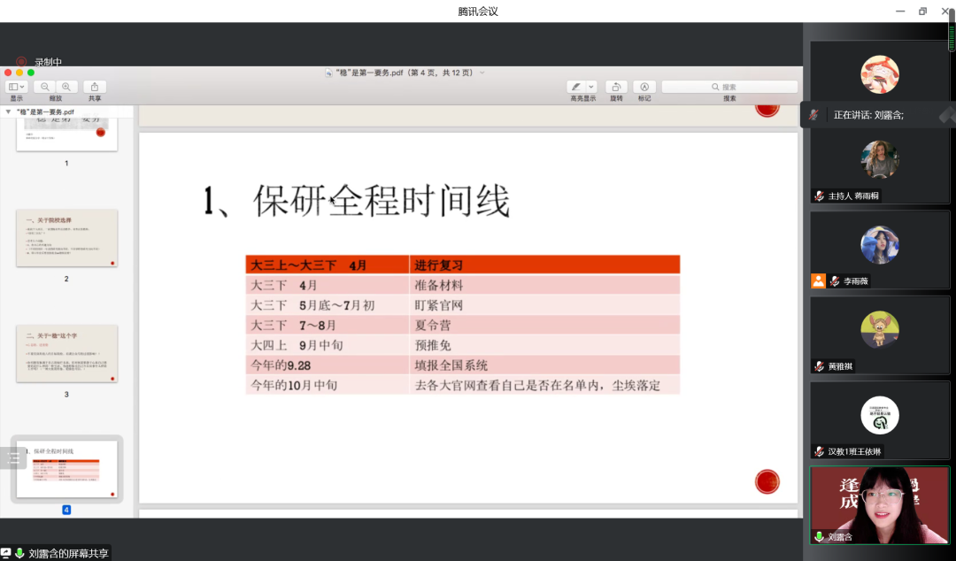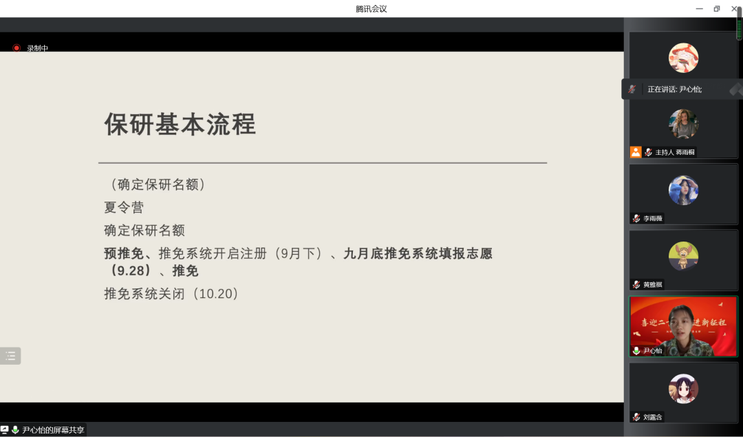 交流会上,李梓瑄作为行政保研的代表,详细讲解了行政保研的准备工作和日常学习生活中的注意点;刘露含则重点讲述了调整心态的方法,她表示,既要保持心态和学习进度的“稳”,也应尽量减少拖延,适量运动来缓解压力;尹心怡则细致地为同学们介绍了保研基本流程,并分享了她的笔试、面试的过程;张洁铭对同学们专业课的学习提出了一些建议,并鼓励同学们欣赏他人优势、多向优秀的人学习;周笑竹则分享了跨专业保研的独特经历,建议有相关想法的同学们独立、主动关注有意向报考的院校信息,重视相关面试技巧;最后,黄可钦分享了自己申请非大陆院校的经验,强调了团队合作和资源利用的重要性。