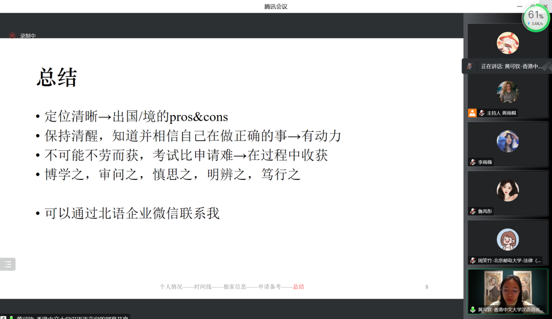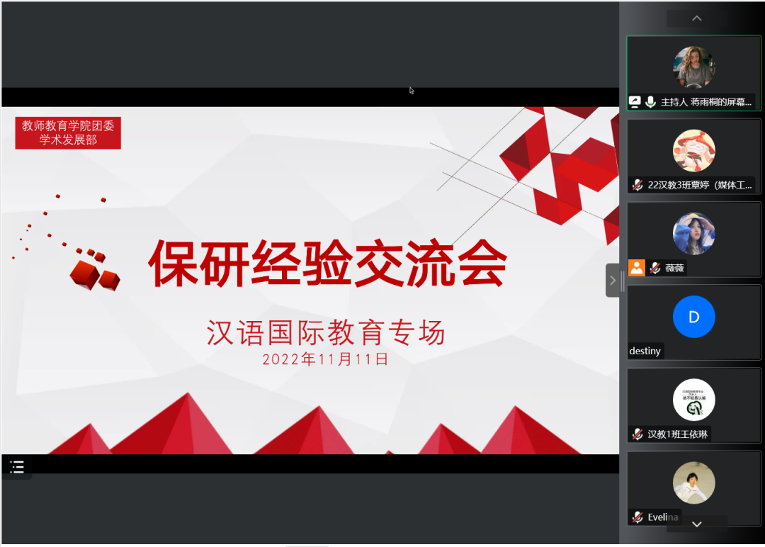 2022年11月11日,教师教育学院“职业生涯主题教育月”之保研经验交流会第二场顺利举办。李梓瑄、刘露含、尹心怡、张洁铭、周笑竹、黄可钦受邀参加本次交流会,全方位、多角度地分享了他们成功“上岸”的经验。学院团委学术发展部部长蒋雨桐主持本次会议。