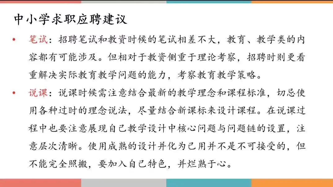 需要注意的是,在中小学教师应聘时说课环节很重要。在说课时,需注意结合最新的教学理念和课程标准,切记使用各种过时的理念说法;尽量结合新课标来设计课程,在说课过程中也要注意展现自己教学设计中核心问题与问题链的设置;同时,需做到层次清晰,使用成熟的设计并化为己用,但不能完全照搬,要加入自己的特色并烂熟于心。